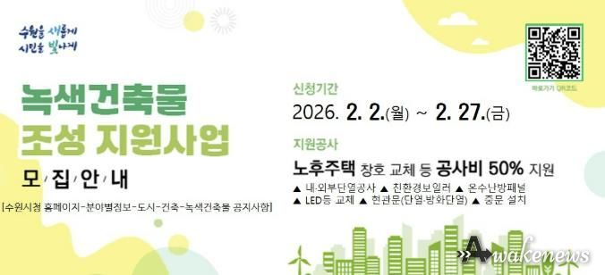 어웨이크뉴스 오경하 기자 | 수원특례시가 2월 2일부터 27일까지 ‘2026년 녹색건축물 조성 지원사업’ 신청을 받는다.