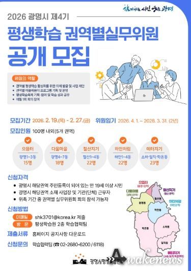 어웨이크뉴스 오경하 기자 | 광명시가 시민 주도의 생활권 중심 평생학습 정책을 강화하기 위해 ‘제4기 평생학습 권역별실무위원회’ 신규 위원 100명을 공개 모집한다.
