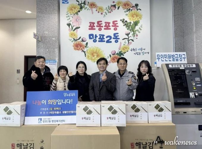 어웨이크뉴스 오경하 기자 | 영통구 망포2동 행정복지센터는 지난 2일, 태장파출소 생활안전협의회가 설 명절을 맞아 저소득 가정을 지원하기 위해 김 50박스를 망포2동 행정복지센터(동장 이용태)에 기탁했다고 밝혔다.