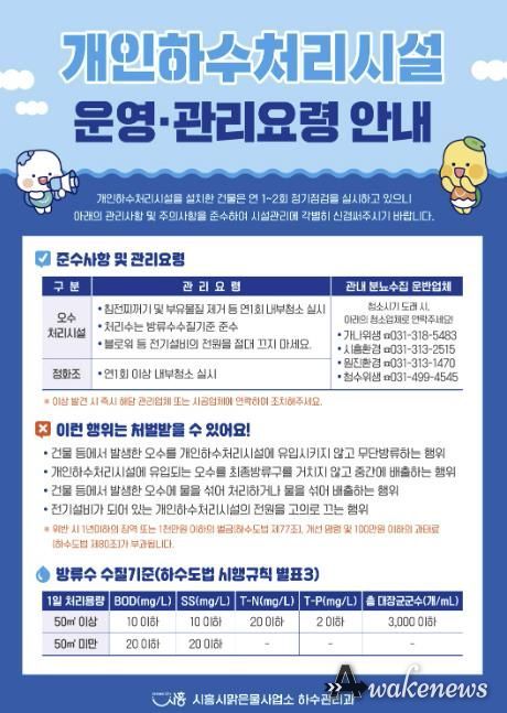 어웨이크뉴스 오경하 기자 | 시흥시는 하천 수질 오염을 예방하고 쾌적한 생활환경을 조성하기 위해 3월부터 관내 개인하수처리시설에 대한 지도점검을 본격적으로 실시한다.