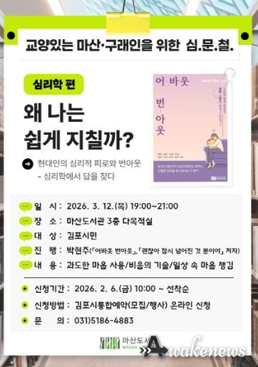 어웨이크뉴스 오경하 기자 | 김포시 마산도서관은 심리적 피로와 번아웃을 주제로 한 인문교양 강연 '왜 나는 쉽게 지칠까?'를 오는 3월 12일 오후 7시부터 9시까지 마산도서관 3층 다목적실에서 운영한다.