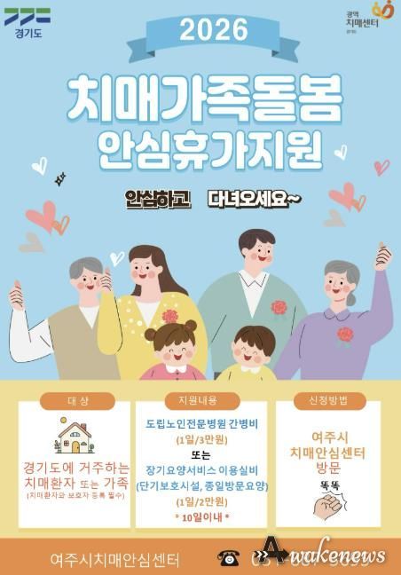 어웨이크뉴스 오경하 기자 | 여주시치매안심센터는 2026년에도 치매환자를 돌보는 가족이 잠시나마 돌봄에서 벗어나 휴식을 취할 수 있도록『치매가족돌봄 안심휴가제』를 지속적으로 운영한다.