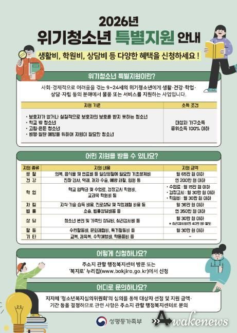 어웨이크뉴스 오경하 기자 | 가평군이 사회·경제적 어려움에 놓인 위기청소년을 대상으로 특별지원 신청을 이달 27일까지 받는다. 보호 기반이 취약한 청소년의 기본 생활을 지키고 학업 중단을 막기 위한 조치다.