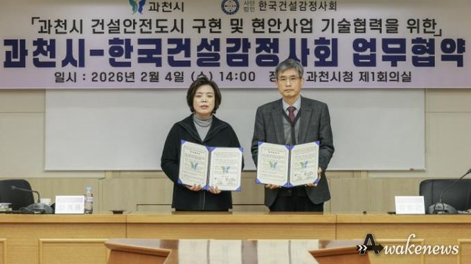 어웨이크뉴스 오경하 기자 | 과천시는 지난 4일 시청 제1회의실에서 신계용 과천시장과 (사)한국건설감정사회 김창근 회장이 참석한 가운데 ‘건설 안전 도시 구현을 위한 기술협력 업무협약’을 체결했다.