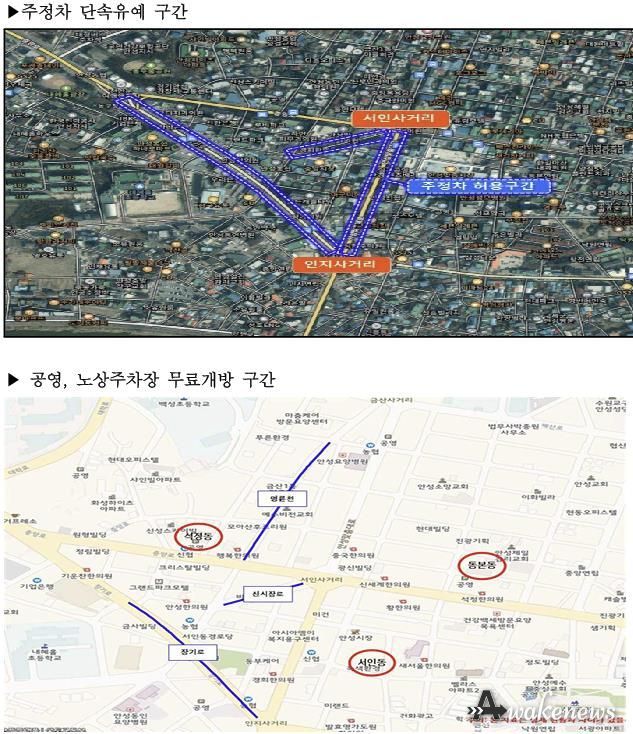 주정차 단속 유예 구간은 안성맞춤시장(서인사거리~인지사거리 구간 양측 300미터)과 중앙시장(서인사거리~안성농협 양측 100미터, 석정삼거리~인지사거리 양측 500미터) 주변 도로이며, 서인동·동본동·석정동의 건축식 공영주차장과 전통시장 주변 노상주차장이 무료 개방된다.