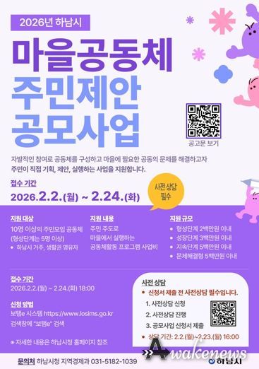 어웨이크뉴스 오경하 기자 | 하남시는 오는 2월 24일까지 ‘2026년 하남시 마을공동체 주민제안 공모사업’에 참여할 주민모임 공동체를 모집한다.