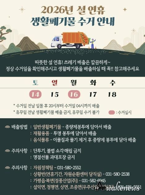어웨이크뉴스 오경하 기자 | 가평군은 설 명절을 맞아 군민과 방문객 모두가 쾌적한 환경에서 청결한 연휴를 보낼 수 있도록 생활폐기물 처리 대책을 마련했다.
