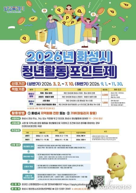 어웨이크뉴스 오경하 기자 | 화성특례시는 청년의 시정 참여와 지역사회 활동을 지원하기 위해 오는 3월 2일부터‘2026년 청년활동포인트제’를 본격 시행한다.