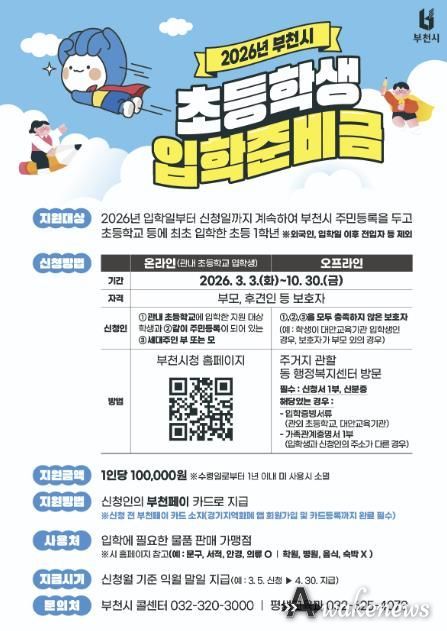 어웨이크뉴스 오경하 기자 | 부천시는 2026학년도 초등학교 입학생의 새로운 출발을 응원하고, 학부모의 경제적 부담을 덜기 위해 초등학교 입학준비금 지원 사업을 추진한다.
