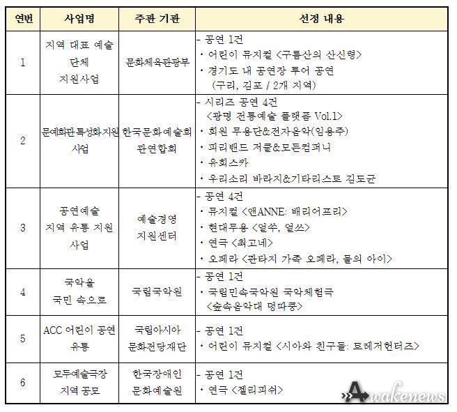 이번에 선정된 사업은 ▲지역 대표예술단체 지원 사업(문화체육관광부) ▲문예회관 특성화 지원 사업(한국문화예술회관연합회) ▲공연예술 지역 유통 지원 사업(예술경영지원센터) ▲지역 문화향유기회 확대를 위한 '국악을 국민 속으로'(국립국악원) ▲ACC 어린이 공연 유통(국립아시아문화전당재단) ▲모두예술극장 지역 공연 공모(한국장애인문화예술원)이다.