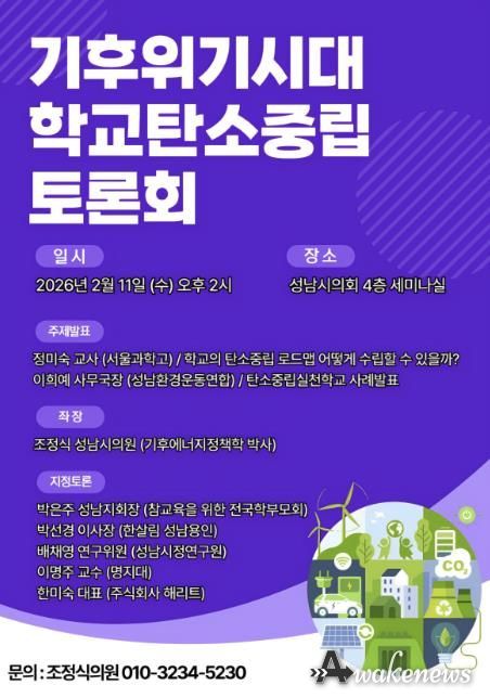 어웨이크뉴스 오경하 기자 | 기후위기 대응과 학교 현장의 탄소중립 실천 방안을 논의하기 위한 '기후위기 시대 학교 탄소중립 토론회'가 오는 2026년 2월 11일 오후 2시, 성남시의회 4층 세미나실에서 열린다.
