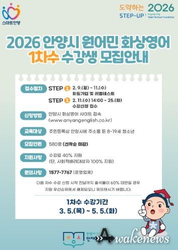 어웨이크뉴스 오경하 기자 | 안양시 인재육성재단은 관내 학생들의 외국어 의사소통 능력 향상과 글로벌 역량 강화를 위해 ‘2026 안양시 원어민 화상영어’ 사업을 지속 운영한다고 9일 밝혔다.