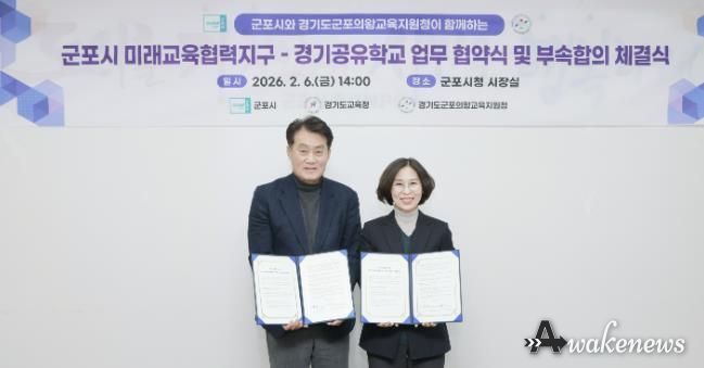 어웨이크뉴스 오경하 기자 | 군포시는 지난 6일 경기도교육청과 ‘군포시 미래교육협력지구–경기공유학교’ 업무협약을 체결하고, 군포의왕교육지원청과 2026년 경기공유학교 학교맞춤형(군포시 미래교육협력지구) 세부사업 추진을 위한 부속합의를 체결했다.