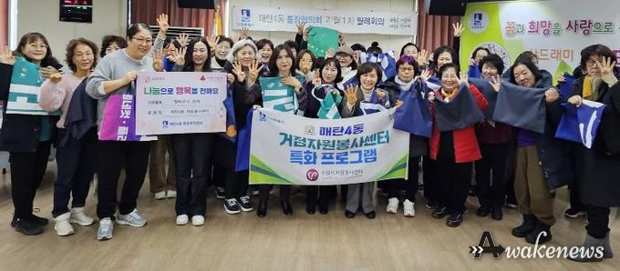 어웨이크뉴스 오경하 기자 | 영통구 매탄4동은 지난 2월 9일, 매탄4동 자원봉사캠프 코치와 봉사 회원들이 마을 공동체 및 지역 상권 활성화를 위해 직접 만든 장바구니를 행정복지센터에 전달했다고 밝혔다.