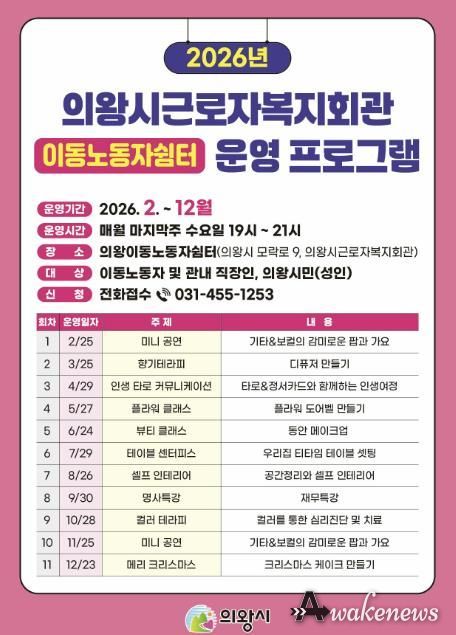 프로그램은 이동 노동자와 의왕 시민(성인)이면 누구나 참여할 수 있으며, 오후 7시부터 9시까지 20명 내외로 운영될 예정이다. 프로그램의 신청은 전화또는 현장 등록을 통해 가능하다.