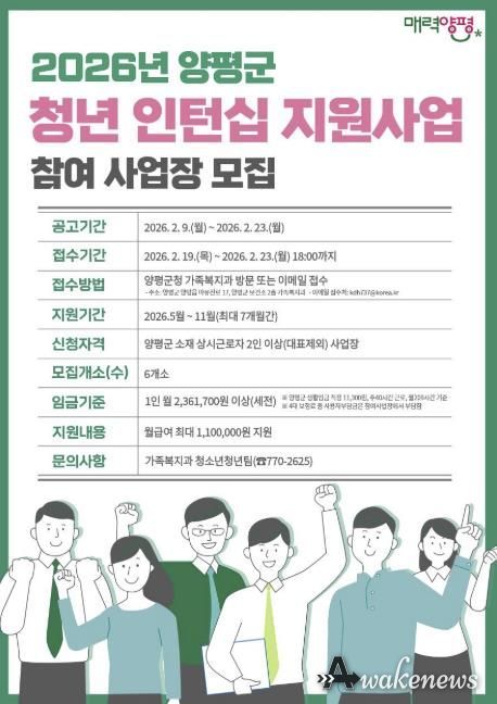 어웨이크뉴스 오경하 기자 | 양평군은 인력이 필요한 관내 사업장과 관내 거주 미취업 청년을 연계하고 사업장에 인건비를 지원하는 ‘청년 인턴십 지원 사업’ 참여 사업장을 오는 2월 19일부터 23일까지 모집한다.