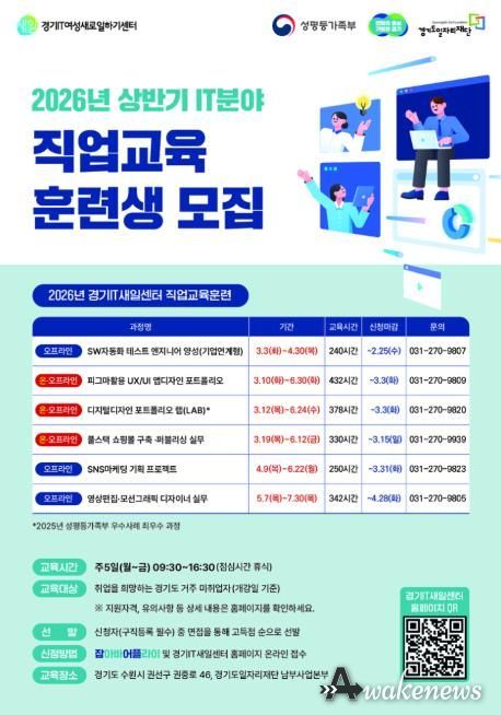 어웨이크뉴스 오경하 기자 | 경기도일자리재단 경기IT새일센터는 3월부터 상반기 IT(정보기술) 직업교육 훈련 7개 과정을 운영하고, IT 분야 취업을 희망하는 136명의 교육생을 모집한다.
