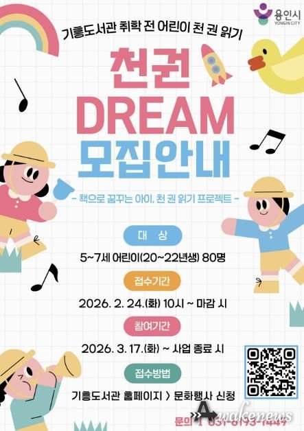 어웨이크뉴스 오경하 기자 | 용인특례시는 오는 24일부터 ‘어린이 천권 읽기, 천권DREAM’ 신규 참여자 80명을 모집한다고 11일 밝혔다.