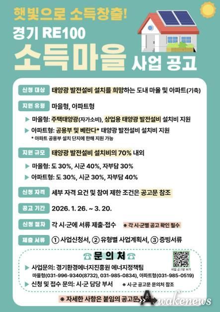 이 사업을 통해 태양광 발전설비를 설치할 경우 경기도와 고양시로부터 ‘마을형’은 설치비의 70%, ‘아파트형’은 60%까지 보조금을 지원받을 수 있다.