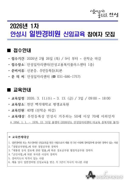 어웨이크뉴스 오경하 기자 | 안성시는 관내 구직자의 안정적인 일자리 창출을 위해 오는 2월 26일부터 '2026년 제1차 안성시 일반경비원 신임 교육' 교육생을 모집한다고 밝혔다.
