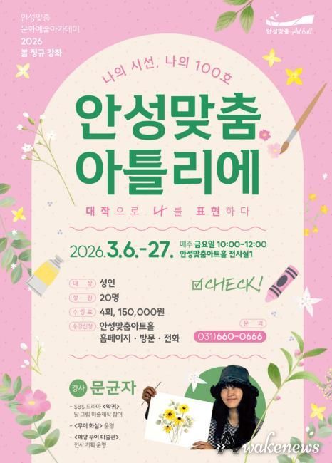 어웨이크뉴스 오경하 기자 | 안성맞춤아트홀은 시민의 문화예술 향유 기회를 확대하고, 생애주기별 맞춤형 예술교육을 제공하기 위해 오는 3월 '2026 안성맞춤아트홀 문화예술 아카데미' 봄 정규 강좌를 운영한다고 밝혔다.