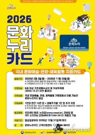 한편, 문화누리카드 지원 대상은 6세 이상 기초생활수급자와 차상위계층으로, 올해는 지난해보다 1만 원 인상된 15만 원으로 지원금이 확대됐다. 또한, 청소년기(13~18세)와 준고령기(60~64세) 대상자에게는 1만 원이 추가 지급된다.