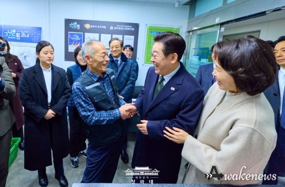 어웨이크뉴스 오경하 기자 | 이재명 대통령과 김혜경 여사는 11일 오후 충주시건강복지타운 안에 위치한 푸드마켓 내 그냥드림 코너를 방문해 운영 현황을 점검하고 종사자들을 격려했다고 안귀령 청와대 부대변인이 서면 브리핑을 통해 전했다.