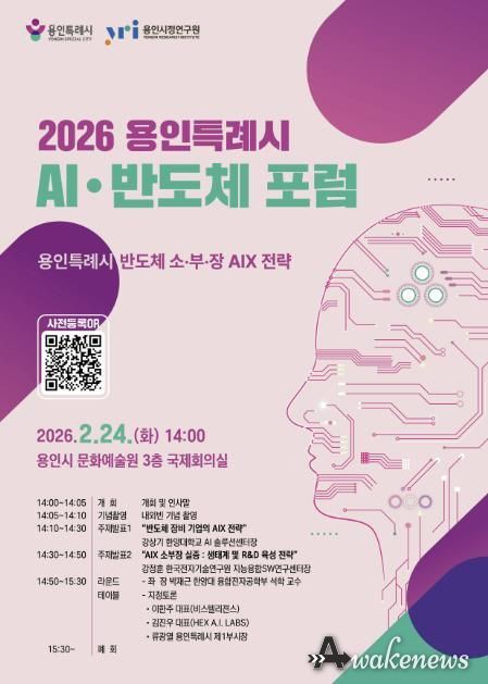 어웨이크뉴스 오경하 기자 | 용인특례시는 오는 24일 오후 2시 용인문화예술원 국제회의실에서 ‘반도체 소재·부품·장비(소·부·장) AIX 전략 포럼’을 개최한다.