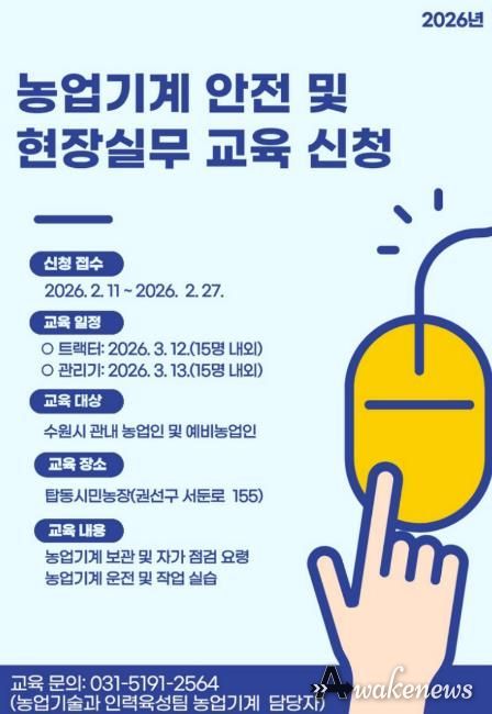 어웨이크뉴스 오경하 기자 | 수원특례시는 ‘2026년 농업기계 안전 및 현장실무 교육’ 수강생을 2월 27일까지 모집한다. 관내 (예비)농업인이 참여할 수 있다.