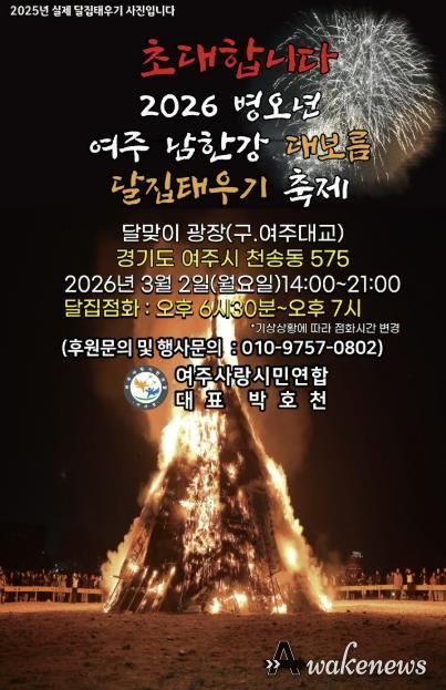 어웨이크뉴스 오경하 기자 | 여주시는 여주사랑시민연합 주관으로 오는 3월 2일 오후 2시 달맞이 광장(연인교 아래/경기도 여주시 천송동 575)에서 정월대보름을 맞아 전통 세시풍속 행사인 ‘달집태우기’ 행사를 개최한다고 밝혔다.