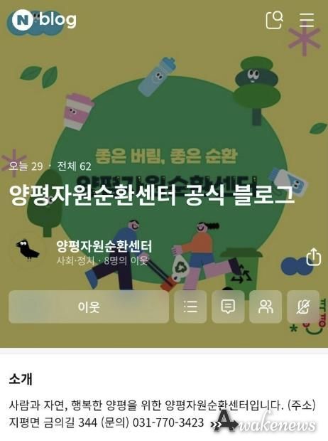 어웨이크뉴스 오경하 기자 | 양평군은 지난 12일 군민과의 소통을 강화하고 자원순환 정보 전달을 확대하기 위해 ‘양평자원순환센터 공식 블로그’를 개설·운영한다고 밝혔다.