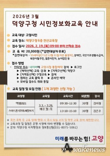 교육은 오는 3월 3일부터 26일까지 덕양구청 전산교육장에서 진행되며, 수강 신청은 이달 19일 오전 9시부터 덕양구청 누리집을 통해 가능하다.