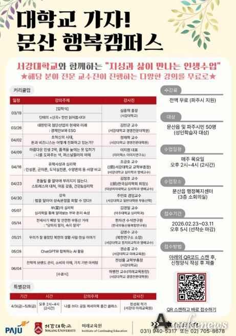 어웨이크뉴스 오경하 기자 | 파주시 문산읍은 지역 주민의 학습권 확대와 수준 높은 평생교육 제공을 위해 서강대학교와 협력해 ‘대학교 가자! 문산행복캠퍼스’를 운영하며 ‘지성과 삶이 만나는 인생수업’을 주제로 평생교육을 진행한다.