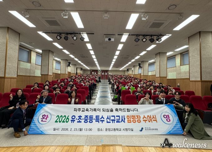어웨이크뉴스 오경하 기자 | 경기도파주교육지원청은 23일 오후, 경기도파주교육지원청 주관으로 운정고등학교 시청각실에서 ‘2026. 3. 1.자 유‧초‧중등‧특수‧비교과 신규교사 임명장 수여식’을 개최하고 총 189명의 신규교사에게 임명장을 수여했다.