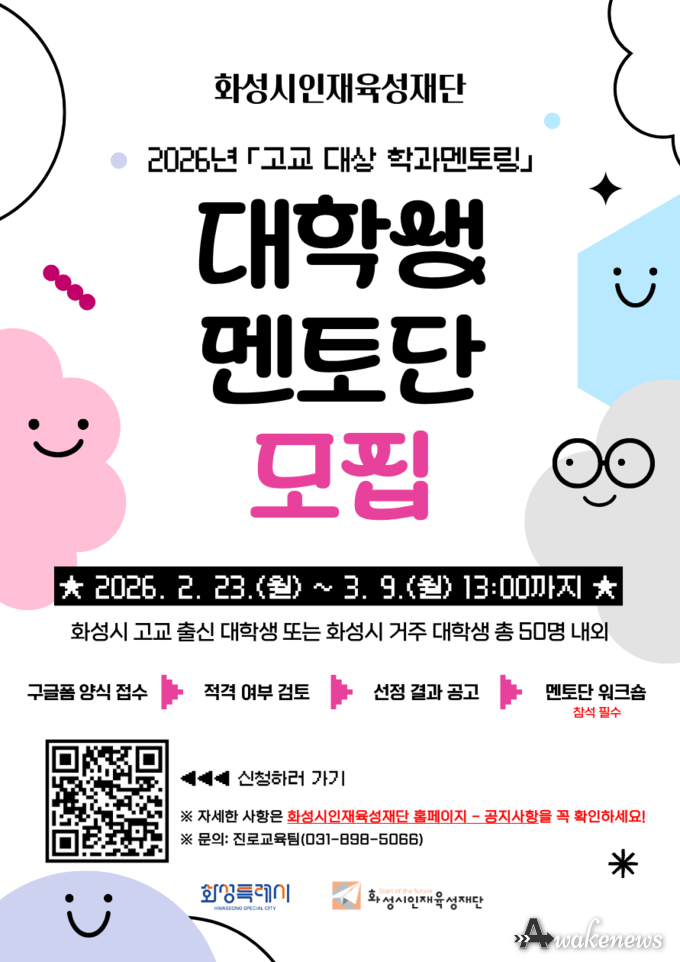 화성시인재육성재단(대표이사 임선일)은 화성시 관내 고등학생을 대상으로 진행하는 진로교육 지원사업의 일환으로, 2026년 ‘고교 대상 학과멘토링’ 대학생 멘토단을 모집한다고 밝혔다.