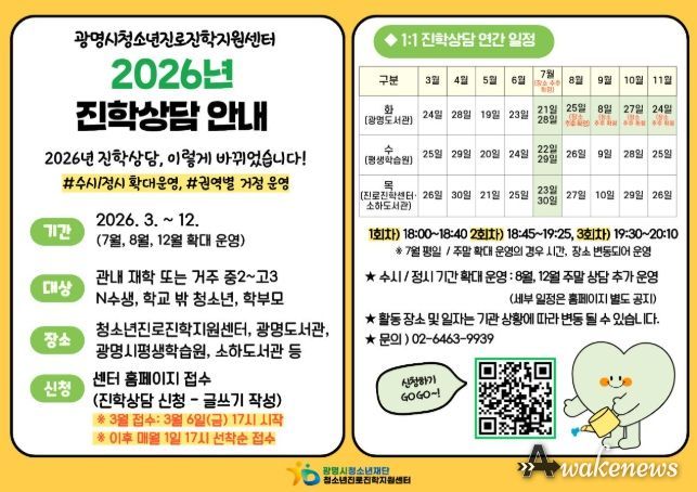 어웨이크뉴스 오경하 기자 | 광명시청소년재단 청소년진로진학지원센터는 관내 청소년과 학부모를 대상으로 2026년 1:1 맞춤형 진학상담을 3월부터 12월까지 운영한다고 밝혔다.