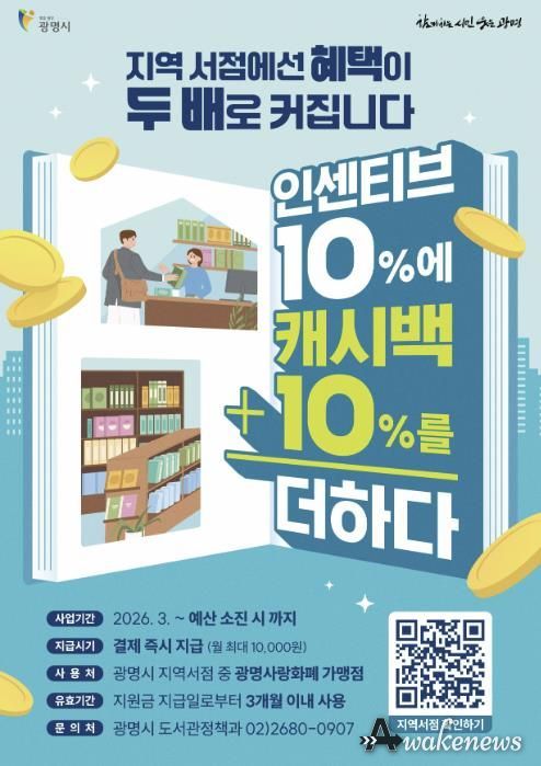 박승원 광명시장은 “독서는 삶의 질을 높이는 가장 기본적인 문화 활동”이라며 “도서구입비 10% 캐시백 사업이 시민의 문화 향유 기회를 넓히고 지역 서점에 새로운 활력이 되길 기대한다”고 밝혔다.