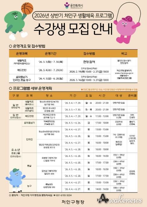 어웨이크뉴스 오경하 기자 | 용인특례시 처인구는 지역 주민의 건강 증진과 여가 활성화를 위해 3월 3일부터 ‘2026년 처인구 생활체육 프로그램’을 운영한다.