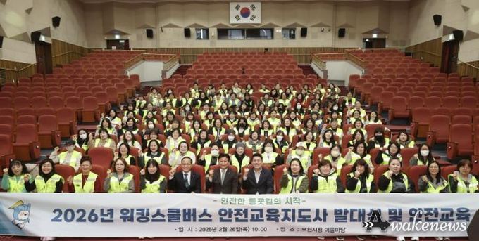 어웨이크뉴스 오경하 기자 | 부천시는 지난 26일 시청 어울마당에서 ‘2026년 어린이통학안전사업(워킹스쿨버스) 발대식 및 안전교육’을 열고 본격적인 사업 추진에 들어갔다. 이날 행사에는 부천시장을 비롯해 안전교육지도사 117명이 참석했으며, 발대식과 직무교육을 통해 어린이 통학 안전 강화 의지를 공유했다.