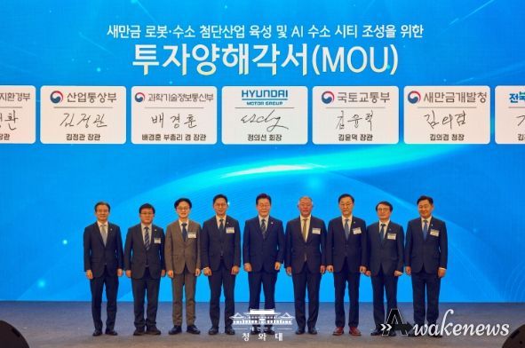 어웨이크뉴스 오경하 기자 | 이재명 대통령은 27일 새만금 로봇·수소·AI 시티 투자 협약식에 참석해 "현대자동차그룹의 혁신 역량 그리고 풍부한 자원이 합쳐진다면 새만금은 최적의 시너지를 발휘하는 기회의 땅이 될 수 있을 것으로 믿는다"고 밝혔다.