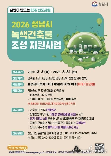어웨이크뉴스 오경하 기자 | 성남시는 노후 건축물의 에너지 효율을 높이고 온실가스 배출을 줄이기 위해 ‘2026년 성남시 녹색건축물 조성 지원사업’을 시행한다. 단열재 보강과 고효율 창호 교체 등 에너지 성능 개선 공사비를 최대 1000만원까지 지원한다.