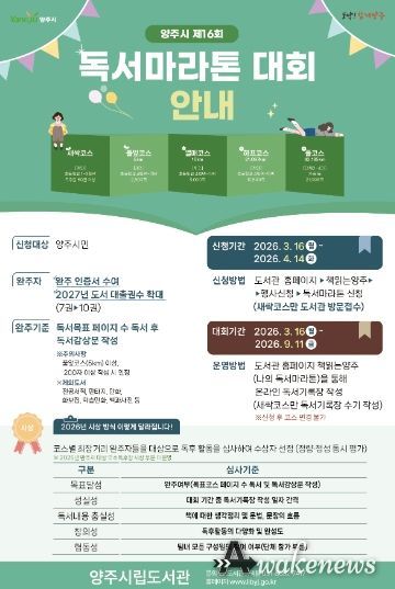 어웨이크뉴스 오경하 기자 | 양주시 도서관에서는 오는 3월 16일부터 9월 11일까지 7개월간 시민 독서 생활화와 책의 가치 공유를 위한 ‘독서마라톤 대회’를 운영한다.