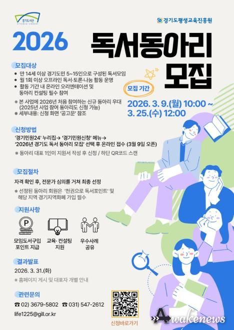 어웨이크뉴스 오경하 기자 | 경기도는 도민의 자발적 독서 활동을 지원하고 책 읽는 문화를 확산시키기 위해 9일부터 25일까지 ‘2026년 경기도 독서동아리’ 400곳을 모집한다.