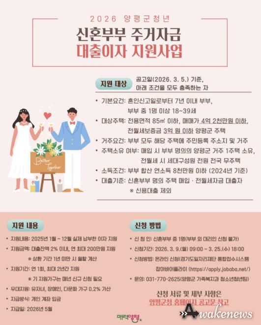 어웨이크뉴스 오경하 기자 | 양평군은 주택 매입 또는 임차(전월세) 자금 대출을 받은 양평군 거주 청년 신혼부부를 대상으로 연간 최대 200만 원의 대출이자를 지원하는 ‘2026년 양평군 청년 신혼부부 주거자금 대출이자 지원 사업’을 시행한다고 5일 밝혔다.