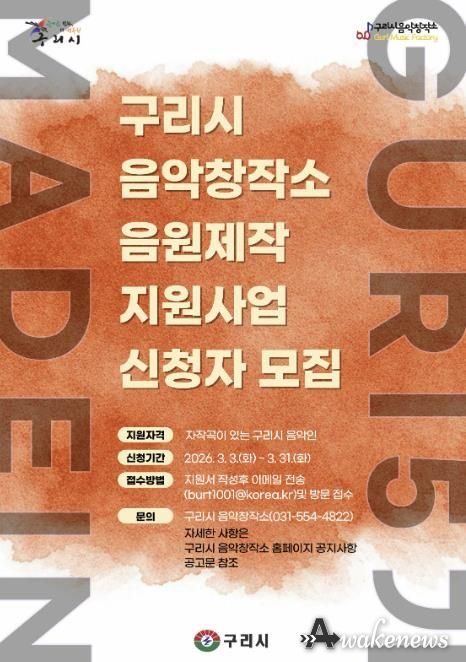 어웨이크뉴스 오경하 기자 | 구리시는 3월부터 추진하는 구리시 음악창작소 지역 아마추어 음악가 음원 제작 지원사업 '2026 Made in Guri(메이드 인 구리)’참여자를 모집한다고 밝혔다.