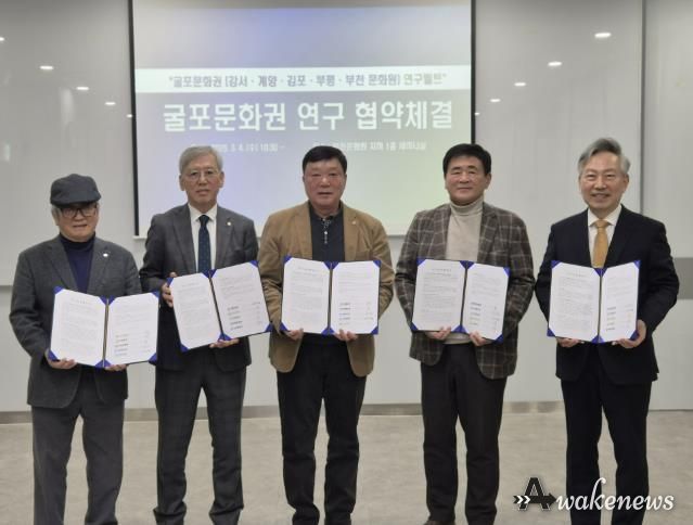 어웨이크뉴스 오경하 기자 | 부천문화원과 강서문화원, 계양문화원, 김포문화원, 부평문화원은 3월 4일 부천문화원에서 ‘굴포문화권’을 토대로 하는 연구교류 협약식을 체결했다. 이로써 ‘굴포’를 같은 문화권으로 하는 부천문화원·강서문화원·계양문화원·김포문화원·부평문화원은 학술대회와 콘텐츠 발굴 사업 등 다양한 지역학 자원을 발굴하고 활성화하기 위해 최초로 지역학 연구 모델을 구축하게 됐다. 특히, 이번 협약은 경기도(부천, 김포), 서울특별시(강서), 인천광역시(계양, 부평)를 잇는 ‘지역학’중심의 연구 교류를 마련한다는 점에서 주목된다.