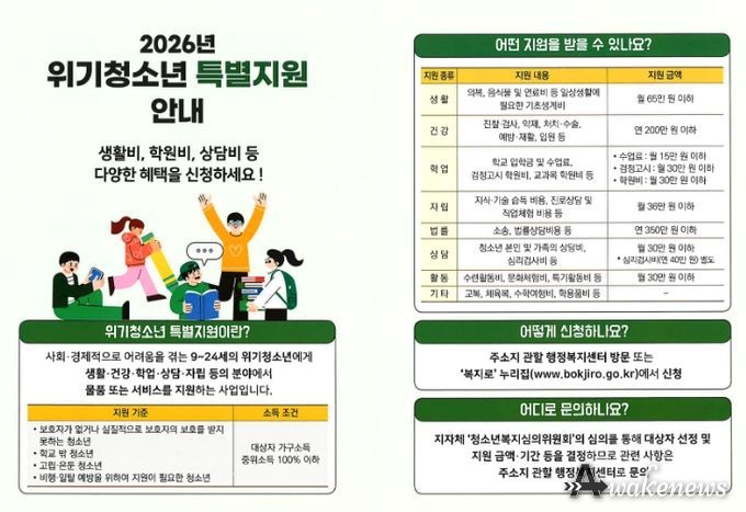 시 관계자는 “청소년이 위기 상황을 벗어나 건강하게 성장할 수 있도록 돕기 위한 사업”이라며 “대상자들이 적기에 지원받을 수 있도록 시민들의 많은 관심과 안내를 부탁한다”고 전했다.