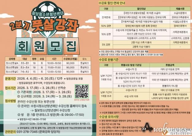 어웨이크뉴스 오경하 기자 | 수원시청소년청년재단 칠보청소년청년센터는 지역 청소년들의 건강한 여가 생활과 체력 증진을 위해녪년 2분기 문화강좌(풋살 교실)’수강생을 모집한다고 밝혔다.