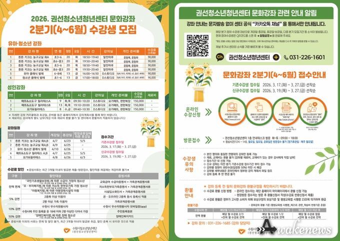 어웨이크뉴스 오경하 기자 | 수원시청소년청년재단 권선청소년청년센터는 오는 3월 17일부터 3월 27일까지 지역사회 평생학습 문화강좌 2분기(4~6월) 수강생을 모집한다.