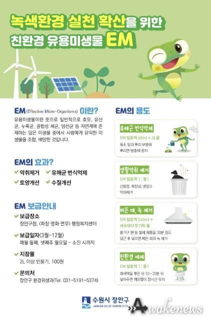어웨이크뉴스 오경하 기자 | 수원시 장안구는 시민들의 친환경 생활 실천을 돕기 위해 동절기 동안 중단했던 친환경 유용미생물 EM 발효액 보급을 3월 9일부터 재개한다.
